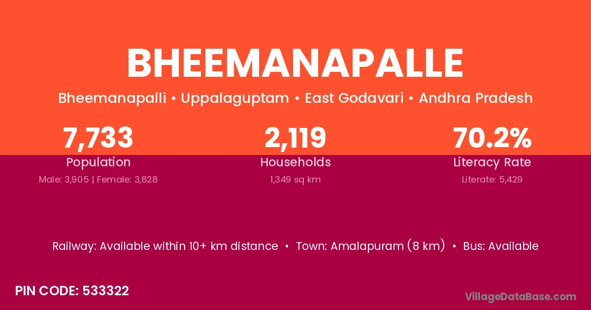 Amalapuram (8 km) is the nearest town to Bheemanapalle village for major economic activities and is located approximately 8 km away.