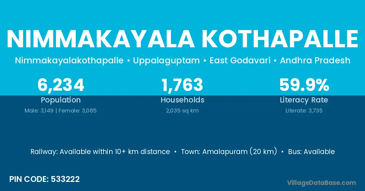 Amalapuram (20 km) is the nearest town to Nimmakayala Kothapalle village for major economic activities and is located approximately 20 km away.