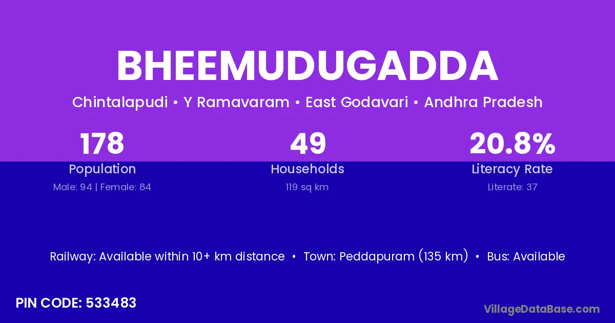 Bheemudugadda village has a total population of 178 people, of which 94 are males and 84 are females.