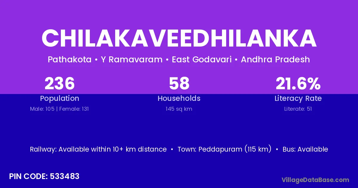 Chilakaveedhilanka village has a total population of 236 people, of which 105 are males and 131 are females.