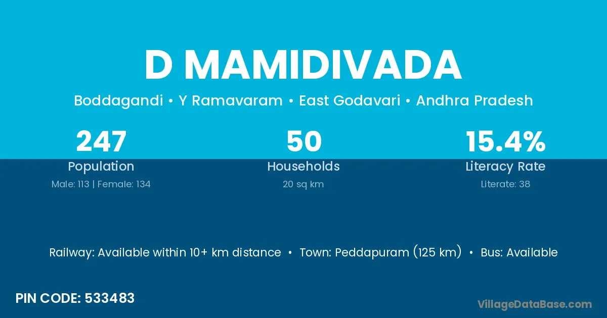 D Mamidivada village has a total population of 247 people, of which 113 are males and 134 are females.