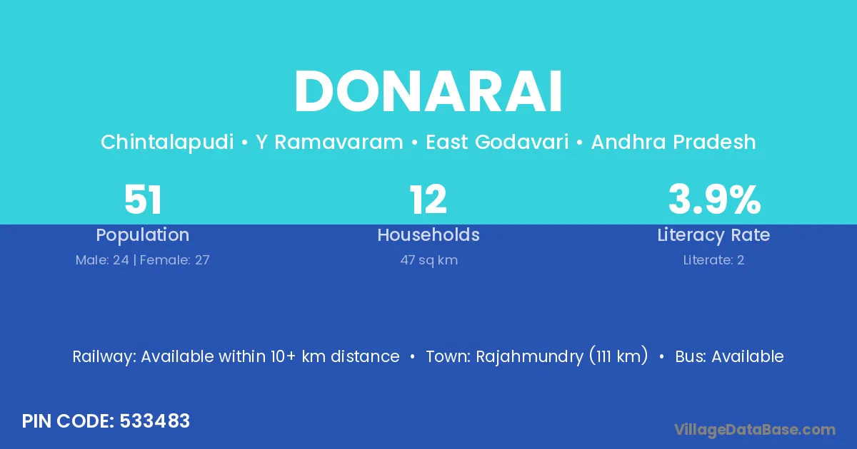 Rajahmundry (111 km) is the nearest town to Donarai village for major economic activities and is located approximately 111 km away.