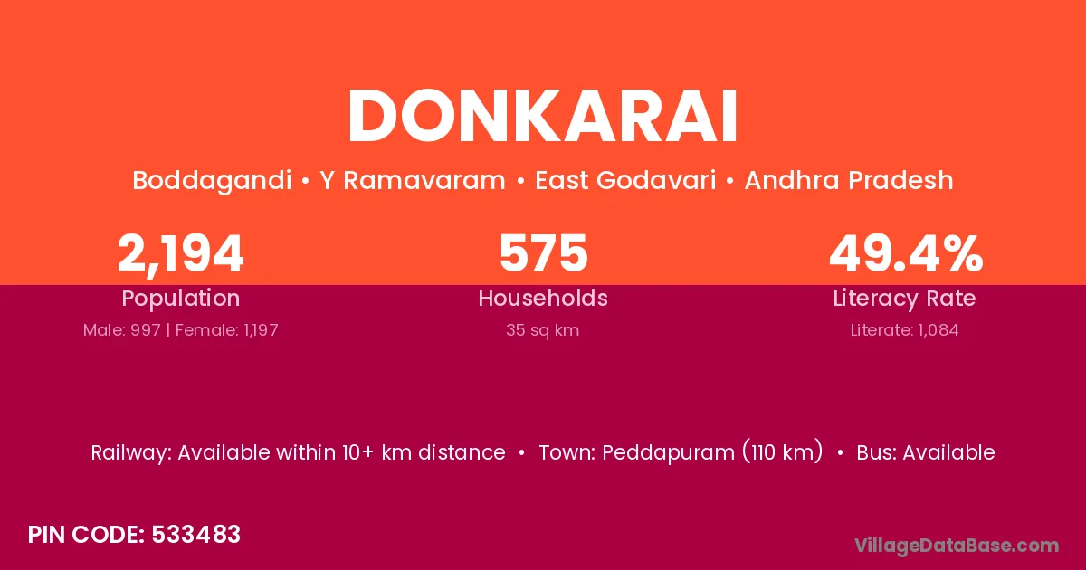 According to Census 2011 information, the village code of Donkarai village is 533483.