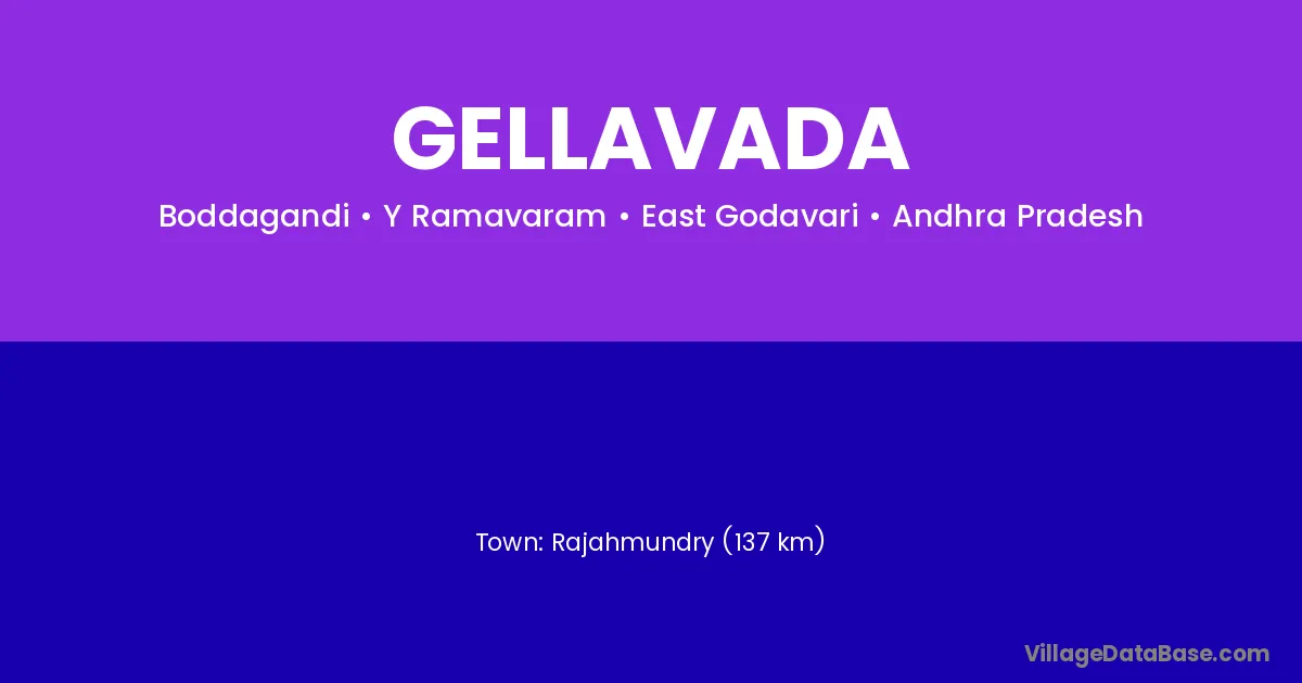 Rajahmundry (137 km) is the nearest town to Gellavada village for major economic activities and is located approximately 137 km away.