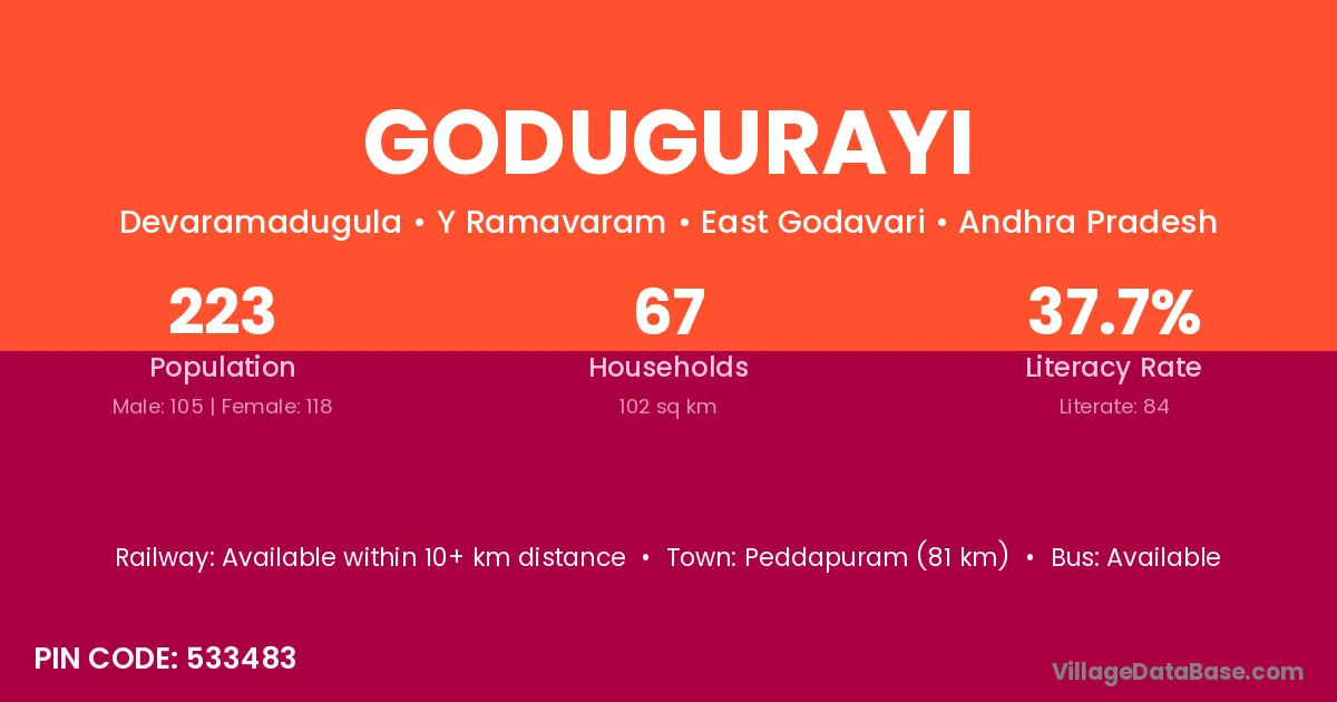 Godugurayi village has a total population of 223 people, of which 105 are males and 118 are females.