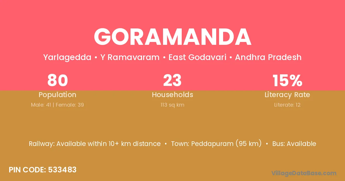 Peddapuram (95 km) is the nearest town to Goramanda village for major economic activities and is located approximately 95 km away.