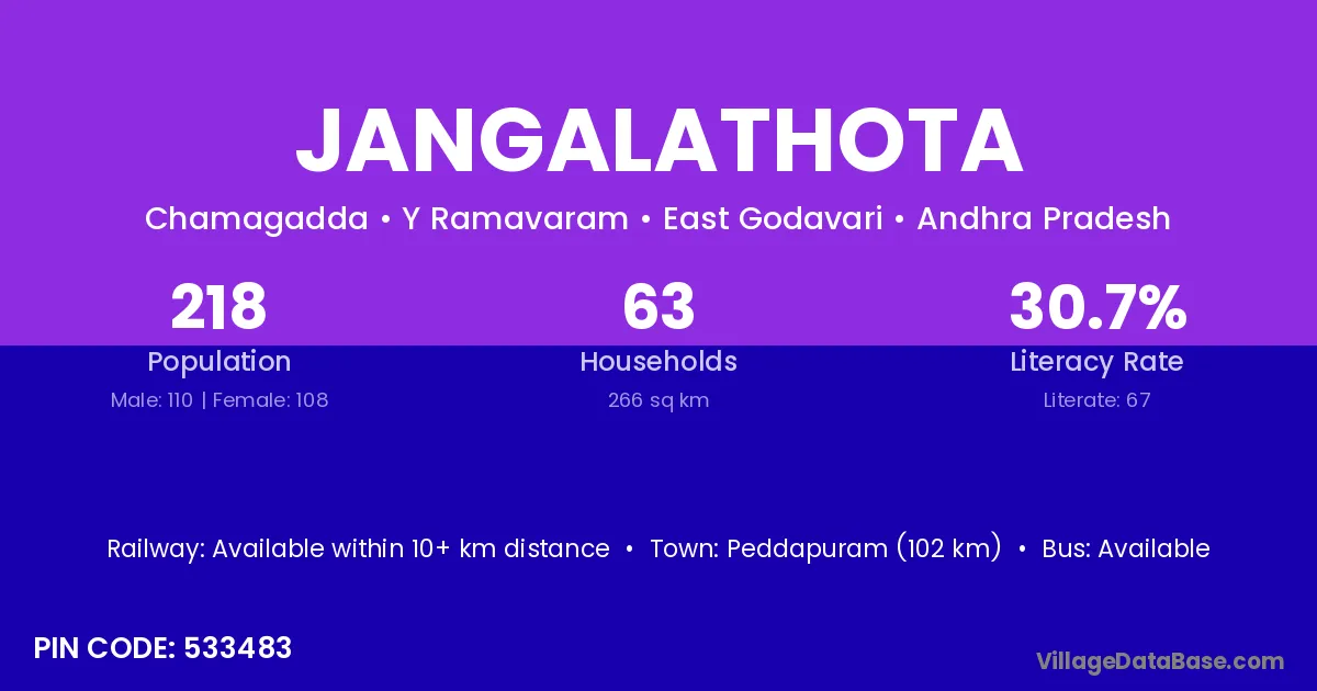 Peddapuram (102 km) is the nearest town to Jangalathota village for major economic activities and is located approximately 102 km away.