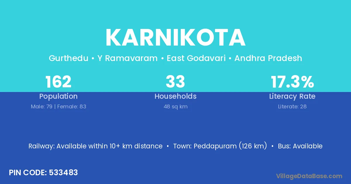 Peddapuram (126 km) is the nearest town to Karnikota village for major economic activities and is located approximately 126 km away.