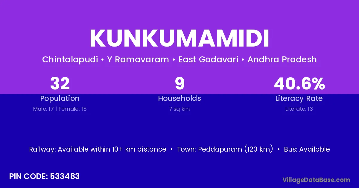 Kunkumamidi village has a total population of 32 people, of which 17 are males and 15 are females.
