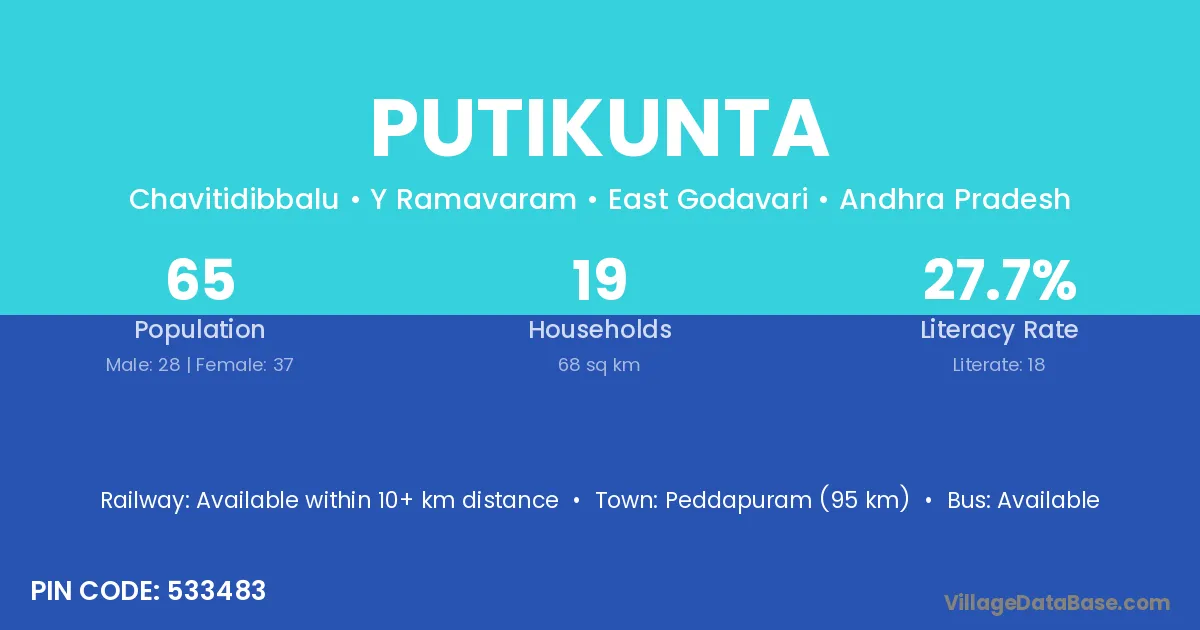Peddapuram (95 km) is the nearest town to Putikunta village for major economic activities and is located approximately 95 km away.