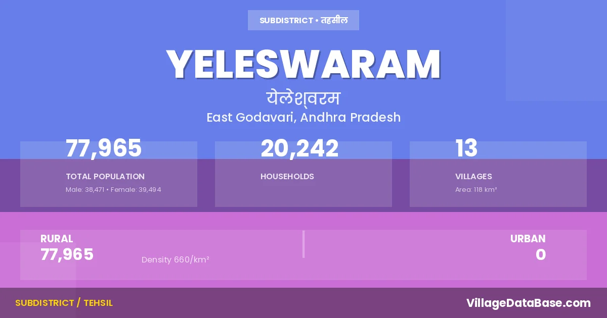 According to the 2011 census The total area of Yeleswaram Mandal is 118 km², with a population of 77965 people. The population density is 660 inhabitants per square kilometre, and there are approximately 20242 houses in the sub district.