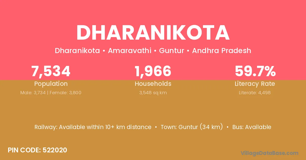 Guntur (34 km) is the nearest town to Dharanikota village for major economic activities and is located approximately 34 km away.