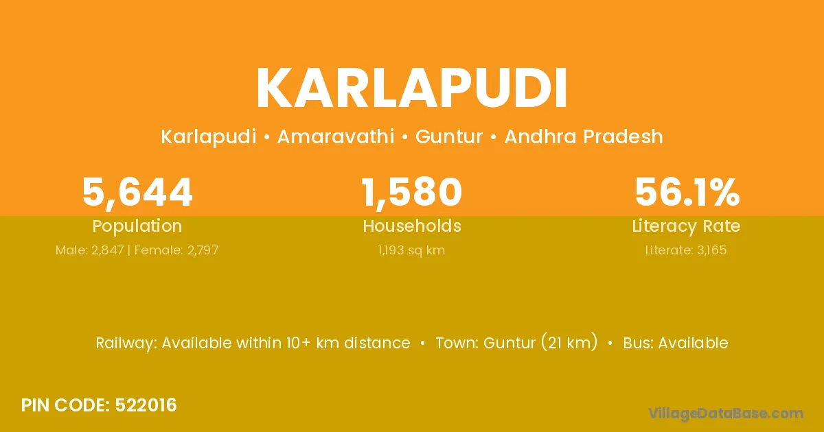 Guntur (21 km) is the nearest town to Karlapudi village for major economic activities and is located approximately 21 km away.