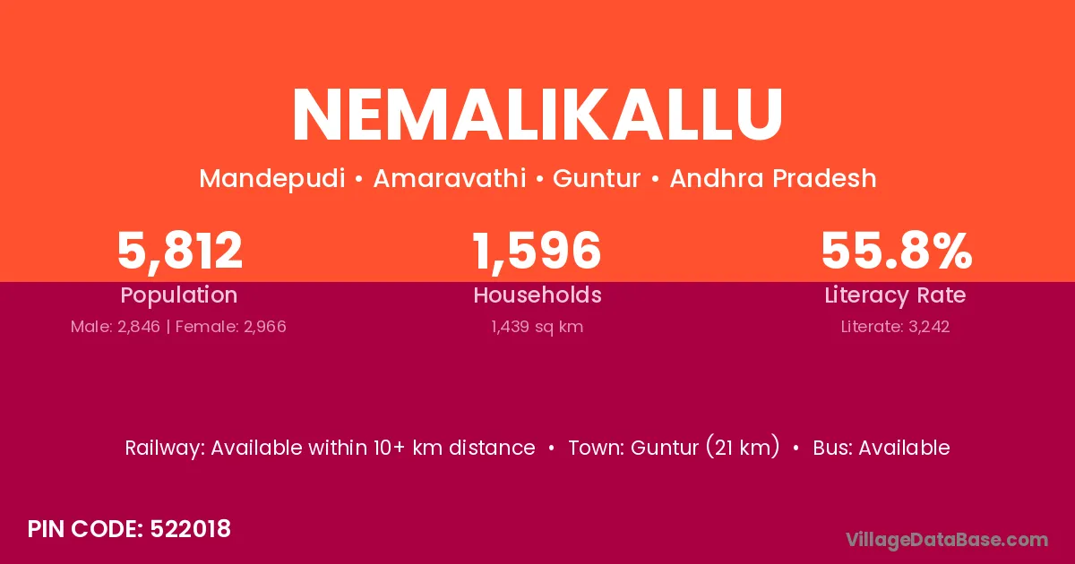 Guntur (21 km) is the nearest town to Nemalikallu village for major economic activities and is located approximately 21 km away.