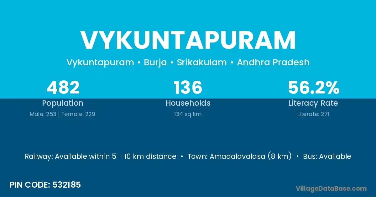 The literacy rate of Vykuntapuram village is 51.79%. Male literacy stands at 59.06% and female literacy at 44.38%.