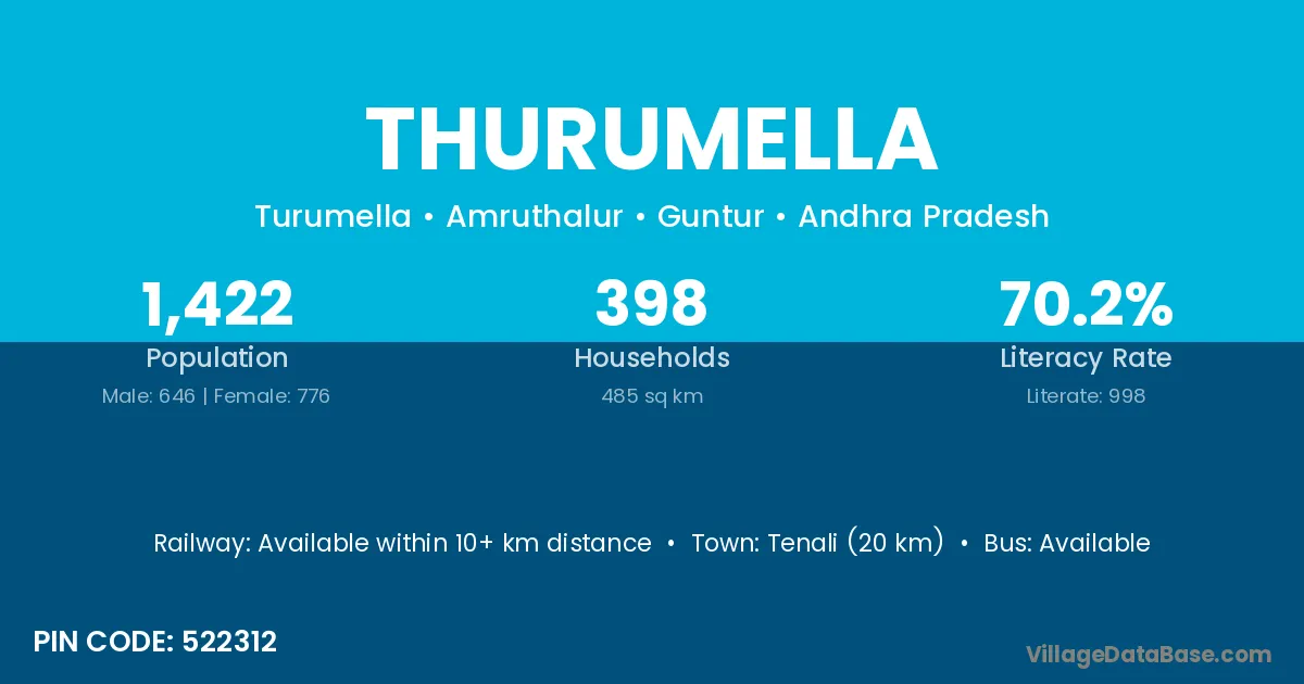 Tenali (20 km) is the nearest town to Thurumella village for major economic activities and is located approximately 20 km away.