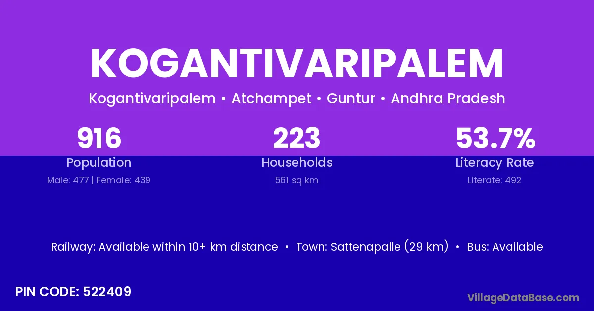 Sattenapalle (29 km) is the nearest town to Kogantivaripalem village for major economic activities and is located approximately 29 km away.
