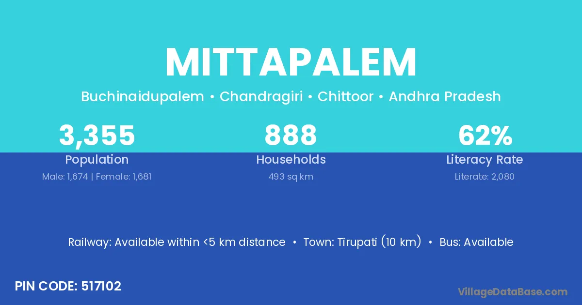 The literacy rate of Mittapalem village is 37.14%. Male literacy stands at 43.37% and female literacy at 30.94%.