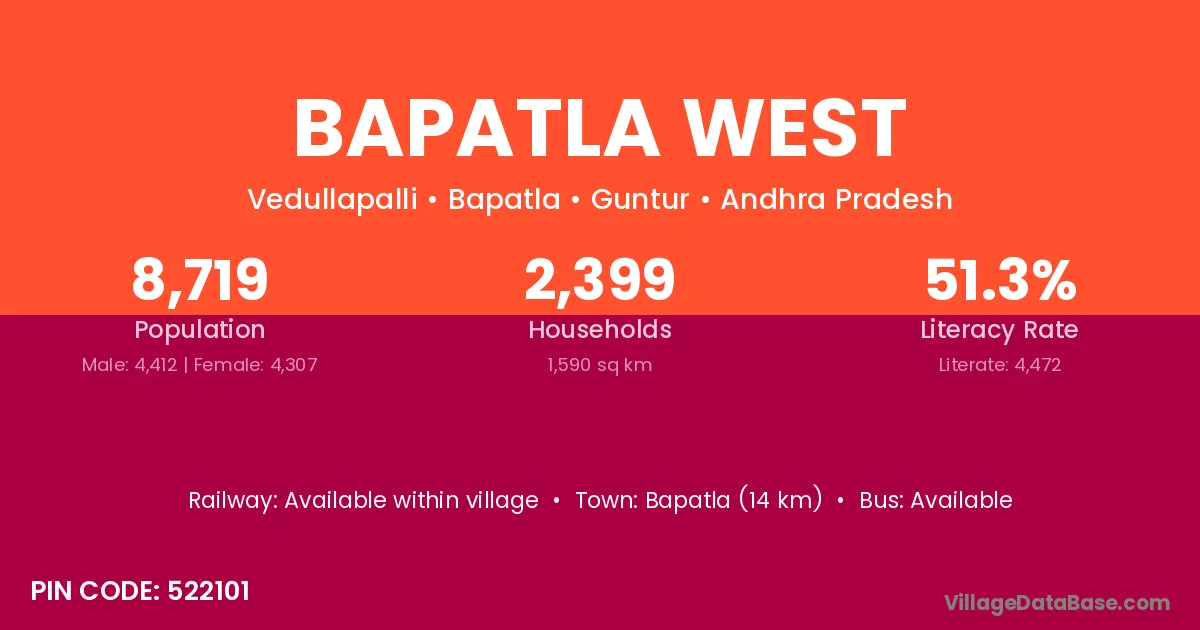 Bapatla West village has a total population of 8,719 people, of which 4,412 are males and 4,307 are females.