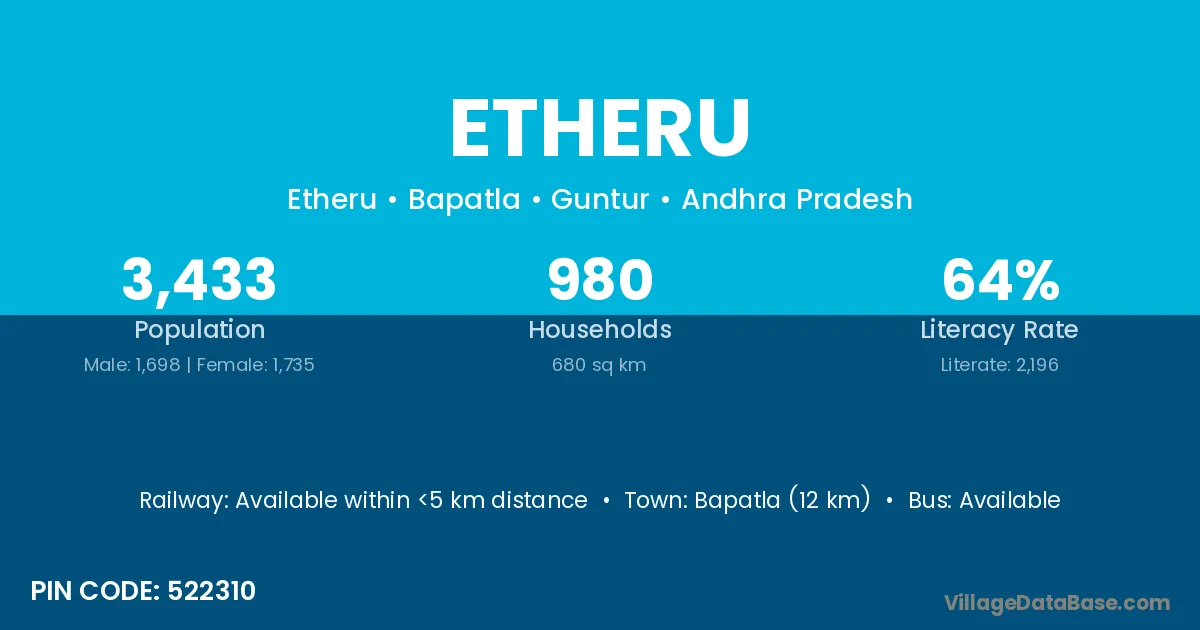 Bapatla (12 km) is the nearest town to Etheru village for major economic activities and is located approximately 12 km away.