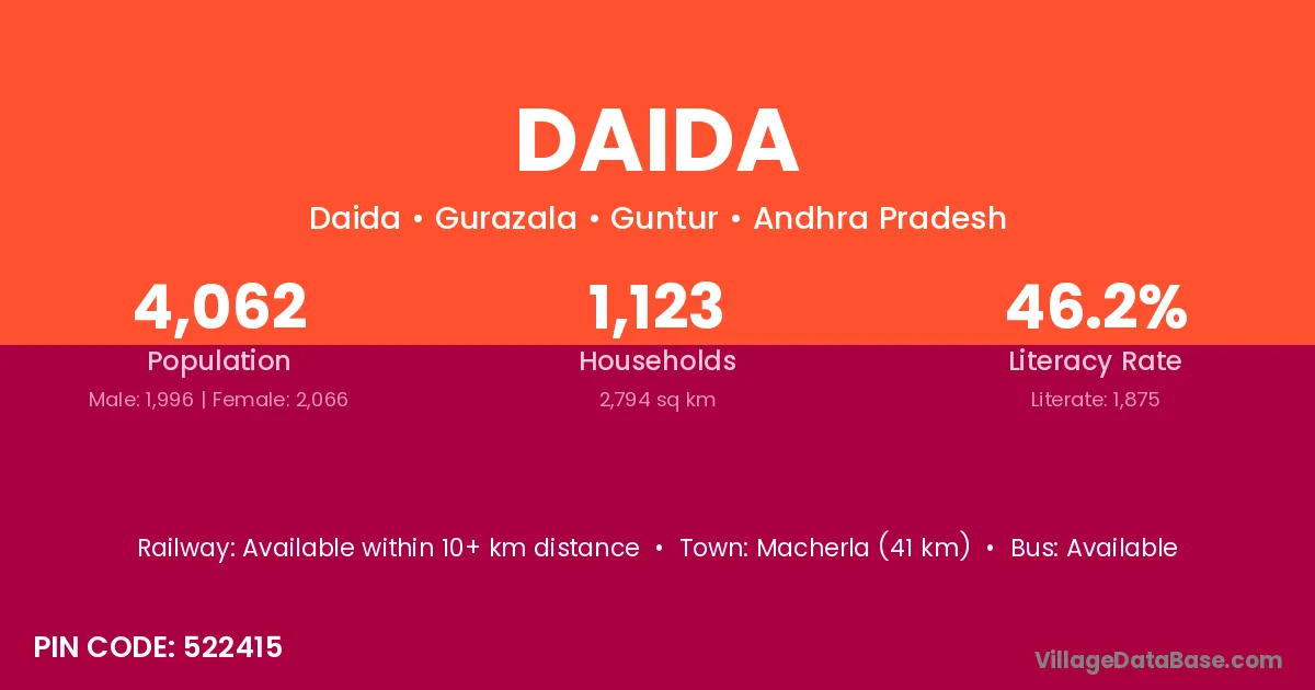 Macherla (41 km) is the nearest town to Daida village for major economic activities and is located approximately 41 km away.