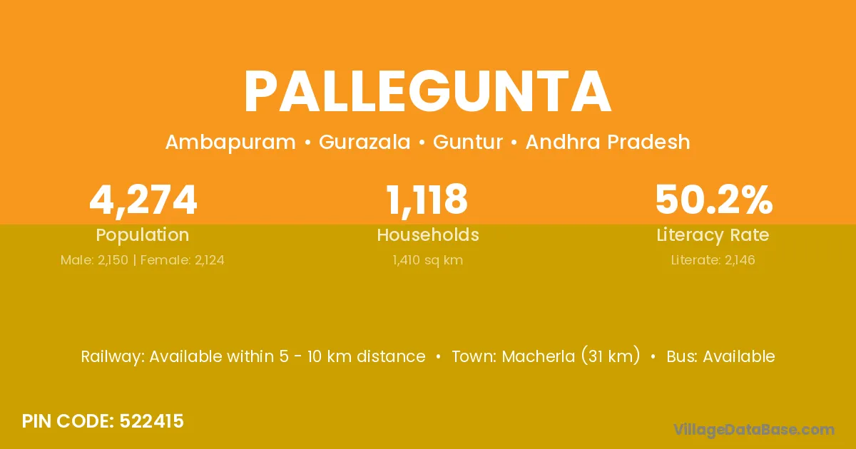 Macherla (31 km) is the nearest town to Pallegunta village for major economic activities and is located approximately 31 km away.