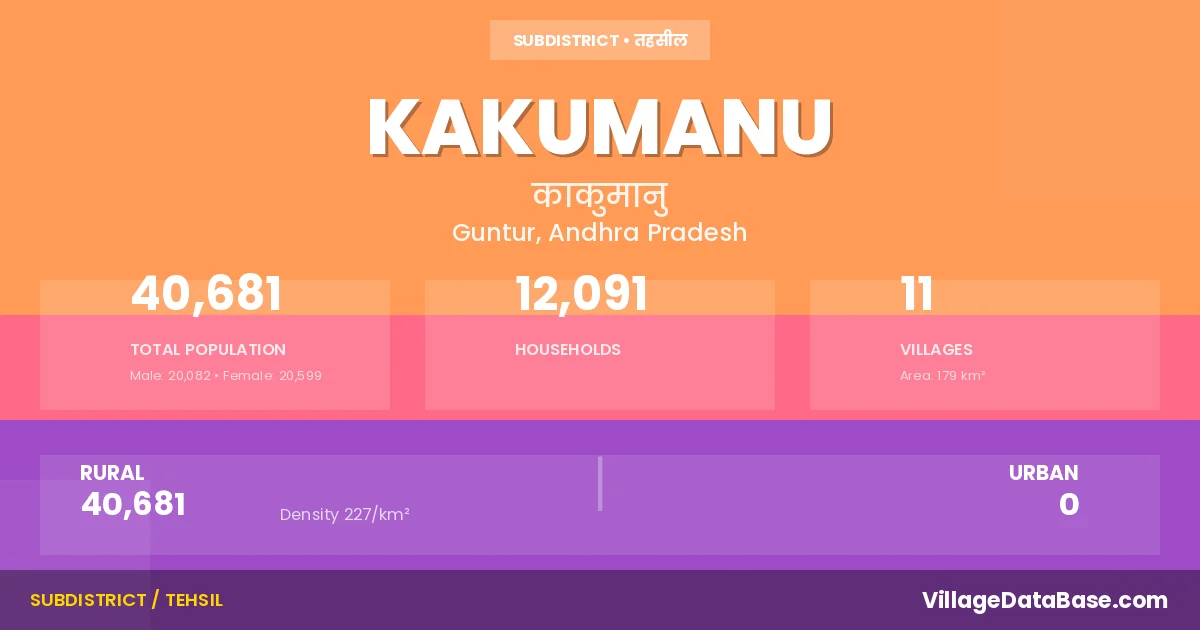 According to the 2011 census The total area of Kakumanu Mandal is 179 km², with a population of 40681 people. The population density is 227 inhabitants per square kilometre, and there are approximately 12091 houses in the sub district.