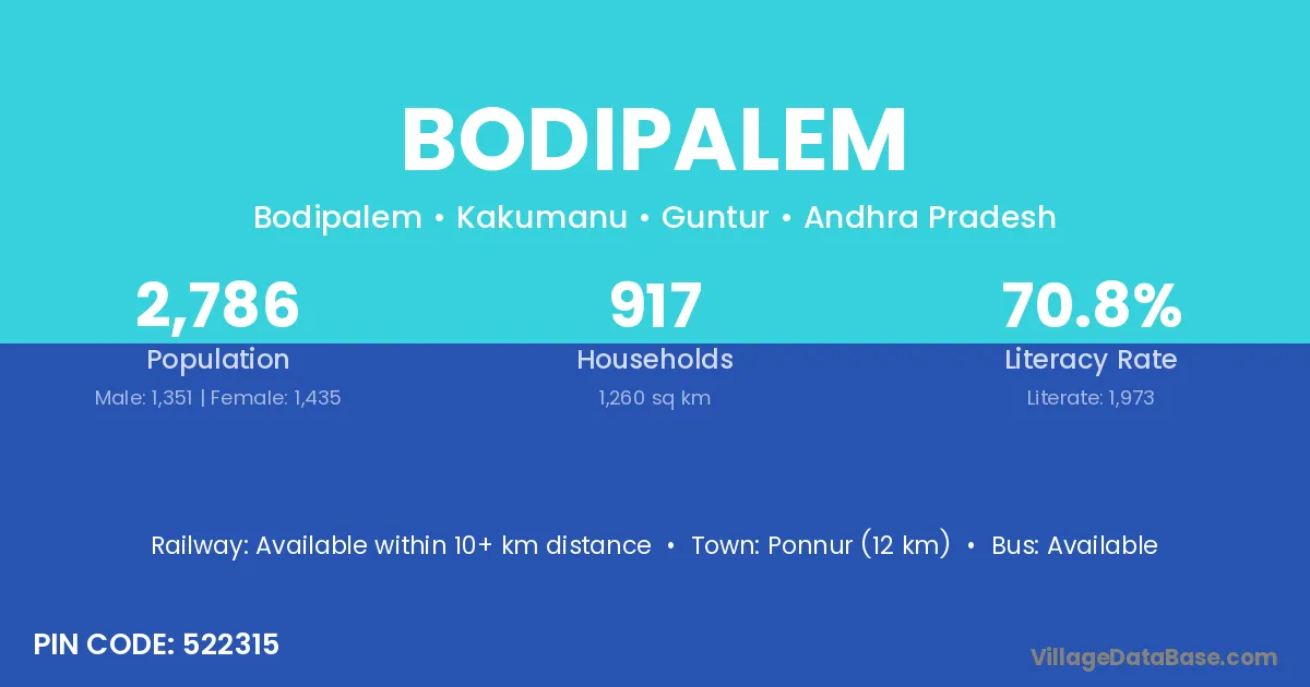 Ponnur (12 km) is the nearest town to Bodipalem village for major economic activities and is located approximately 12 km away.