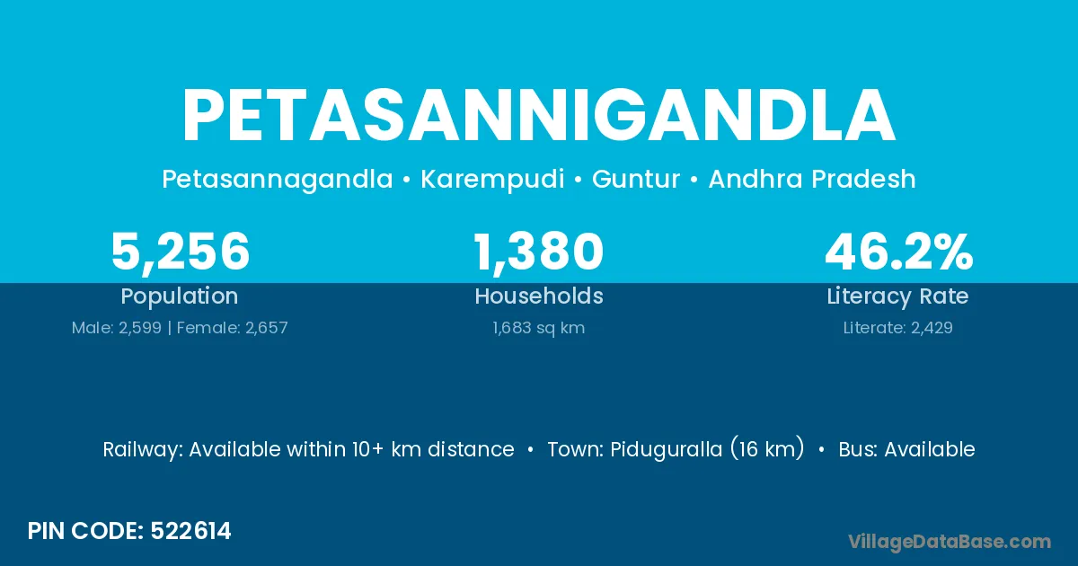 Petasannigandla village has a total population of 5,256 people, of which 2,599 are males and 2,657 are females.