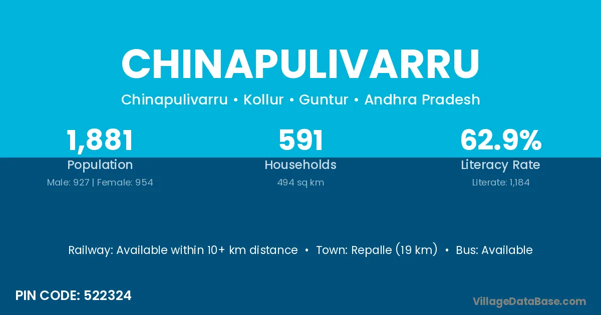 Repalle (19 km) is the nearest town to Chinapulivarru village for major economic activities and is located approximately 19 km away.