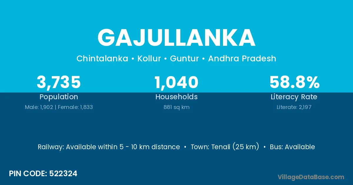 Tenali (25 km) is the nearest town to Gajullanka village for major economic activities and is located approximately 25 km away.