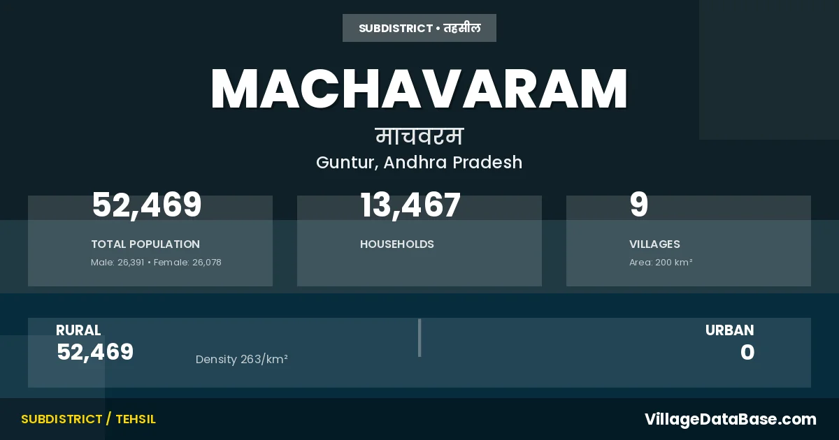 According to the 2011 census The total area of Machavaram Mandal is 200 km², with a population of 52469 people. The population density is 263 inhabitants per square kilometre, and there are approximately 13467 houses in the sub district.