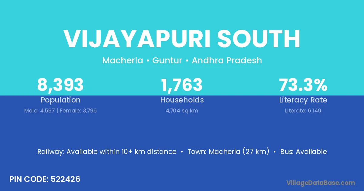Macherla (27 km) is the nearest town to Vijayapuri South village for major economic activities and is located approximately 27 km away.