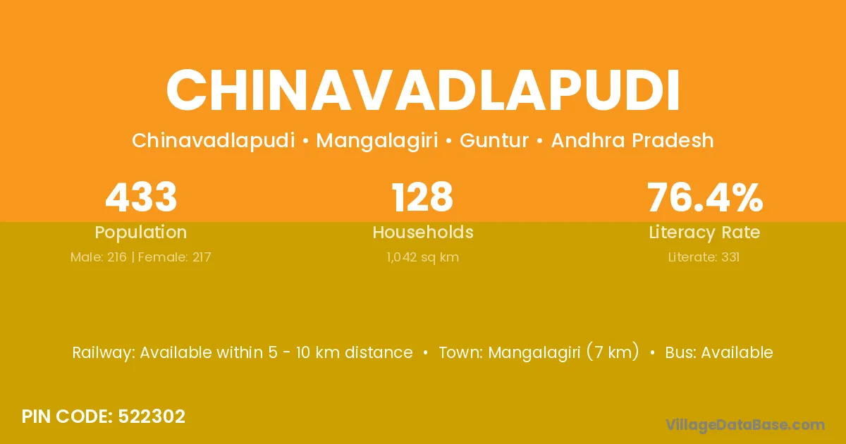 Chinavadlapudi village has a total population of 433 people, of which 216 are males and 217 are females.