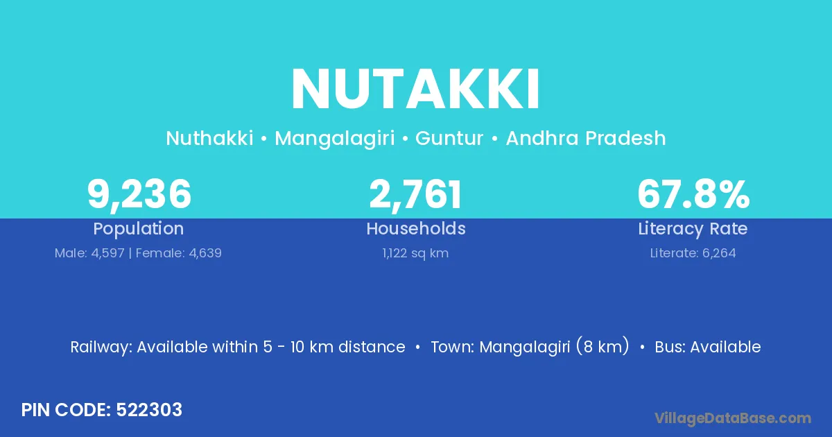Mangalagiri (8 km) is the nearest town to Nutakki village for major economic activities and is located approximately 8 km away.