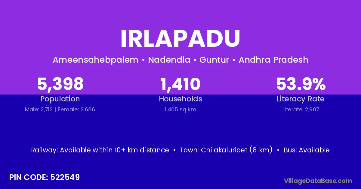 Chilakaluripet (8 km) is the nearest town to Irlapadu village for major economic activities and is located approximately 8 km away.