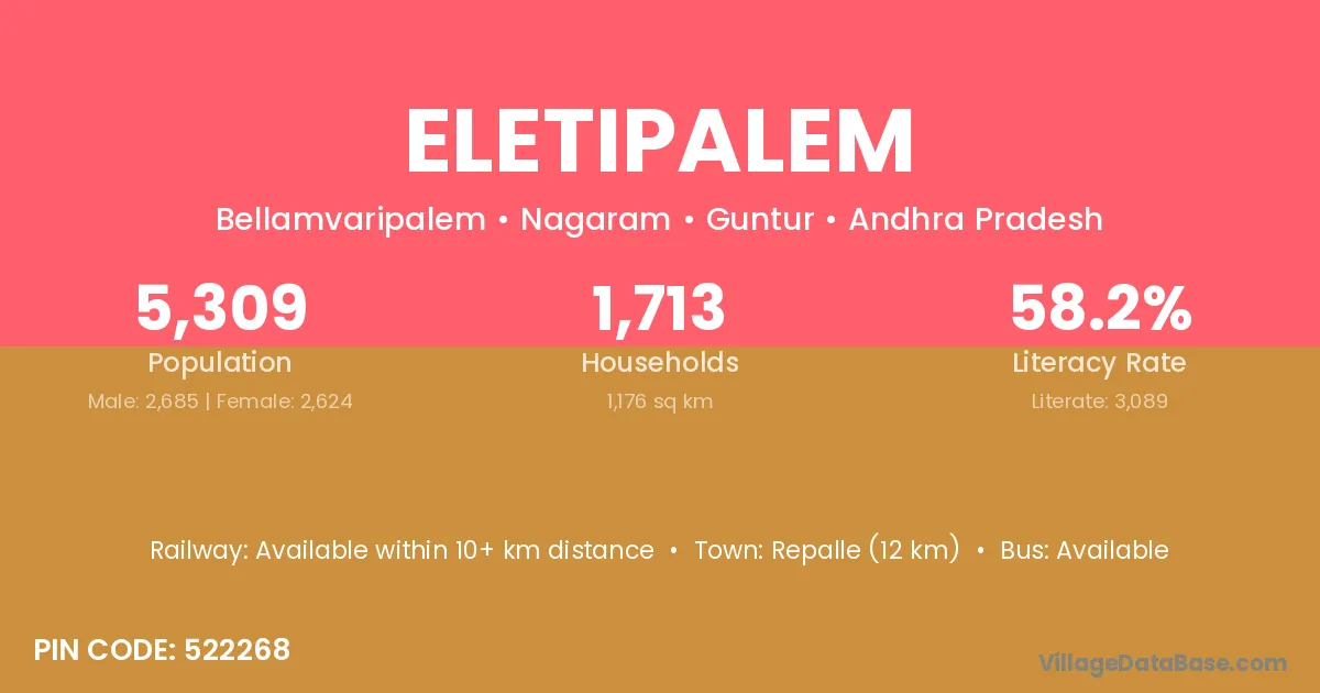 Repalle (12 km) is the nearest town to Eletipalem village for major economic activities and is located approximately 12 km away.