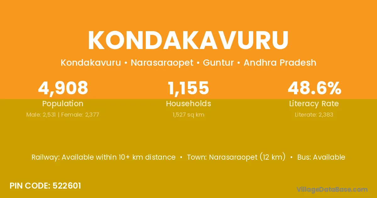 Kondakavuru village has a total population of 4,908 people, of which 2,531 are males and 2,377 are females.