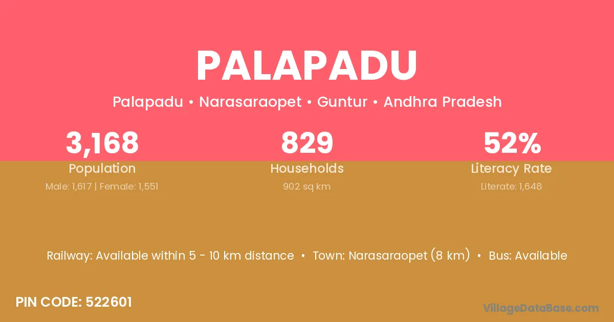 Narasaraopet (8 km) is the nearest town to Palapadu village for major economic activities and is located approximately 8 km away.