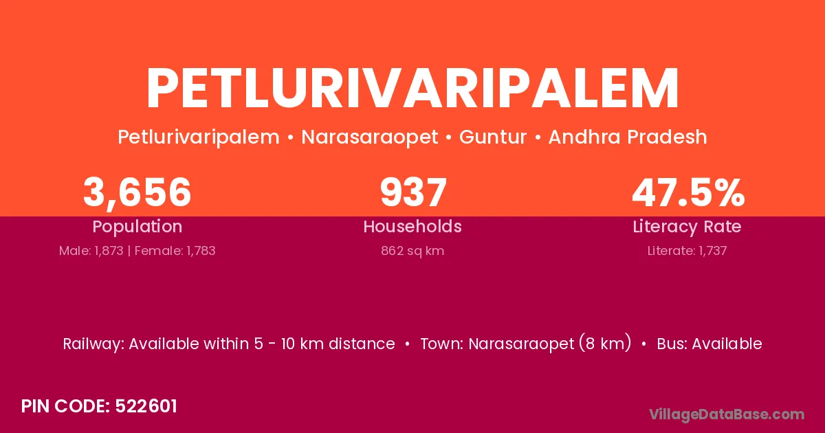 Narasaraopet (8 km) is the nearest town to Petlurivaripalem village for major economic activities and is located approximately 8 km away.