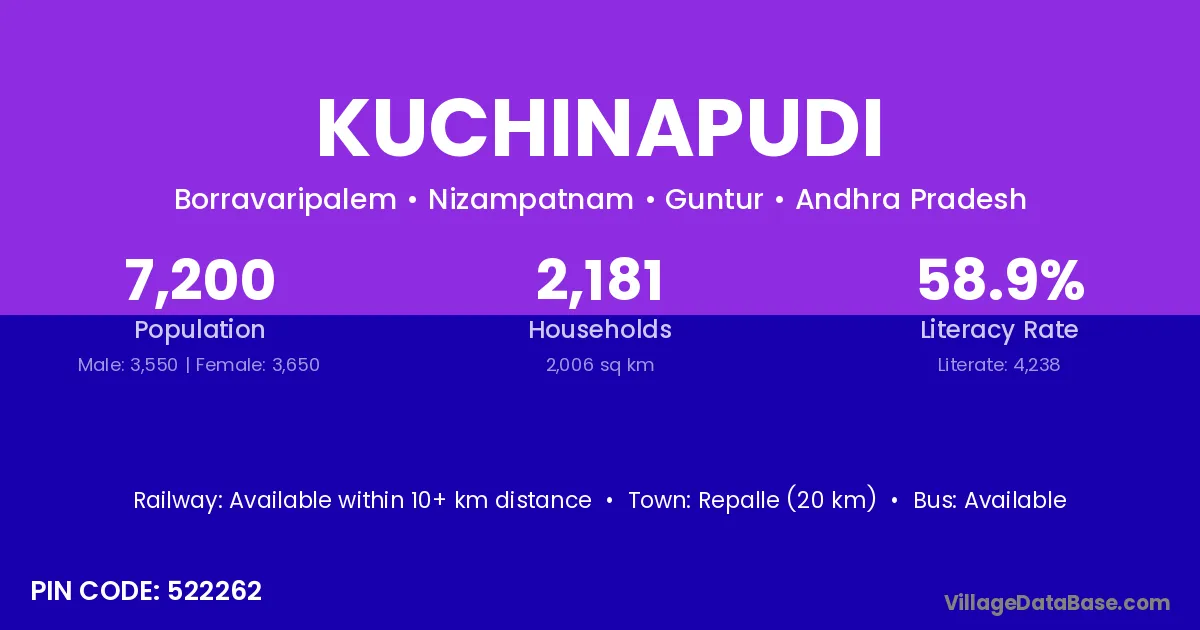 Repalle (20 km) is the nearest town to Kuchinapudi village for major economic activities and is located approximately 20 km away.
