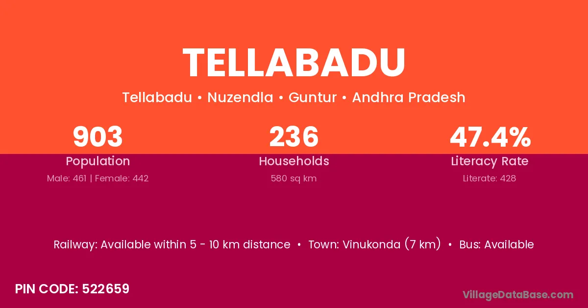 Vinukonda (7 km) is the nearest town to Tellabadu village for major economic activities and is located approximately 7 km away.
