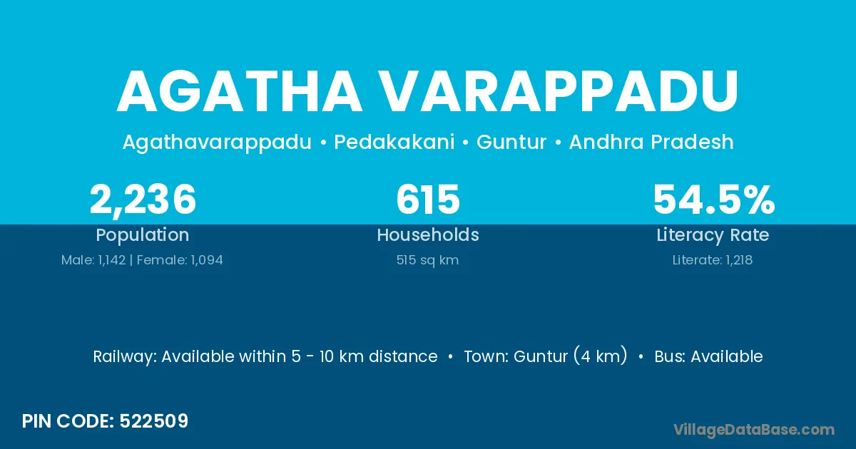 Guntur (4 km) is the nearest town to Agatha Varappadu village for major economic activities and is located approximately 4 km away.