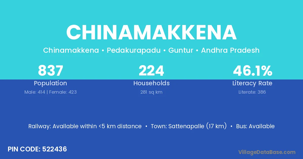 Sattenapalle (17 km) is the nearest town to Chinamakkena village for major economic activities and is located approximately 17 km away.
