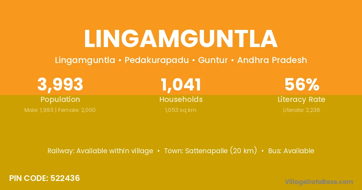 Sattenapalle (20 km) is the nearest town to Lingamguntla village for major economic activities and is located approximately 20 km away.