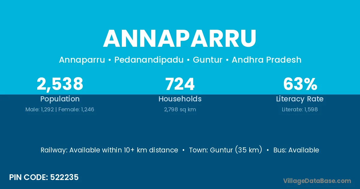 Guntur (35 km) is the nearest town to Annaparru village for major economic activities and is located approximately 35 km away.