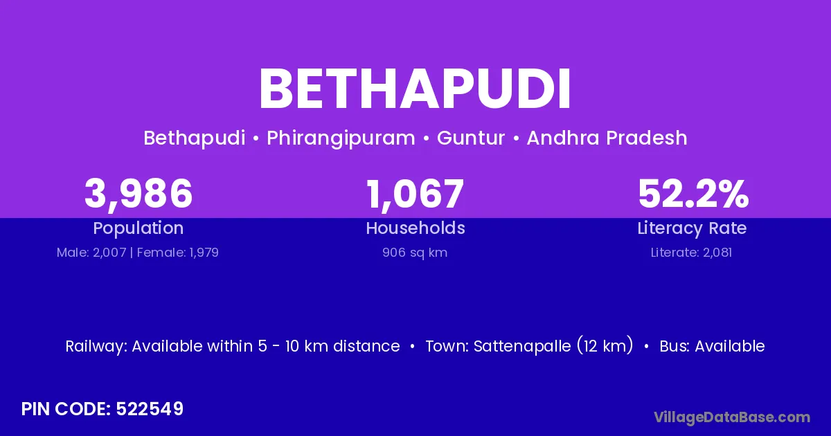 Sattenapalle (12 km) is the nearest town to Bethapudi village for major economic activities and is located approximately 12 km away.