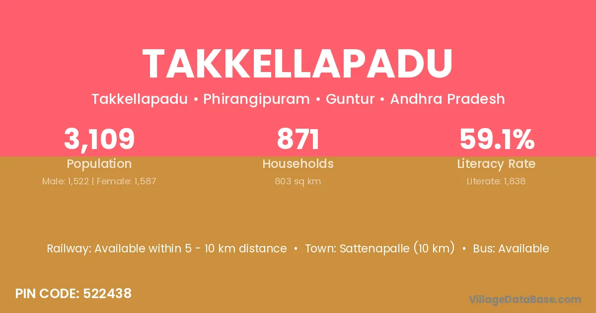 Sattenapalle (10 km) is the nearest town to Takkellapadu village for major economic activities and is located approximately 10 km away.