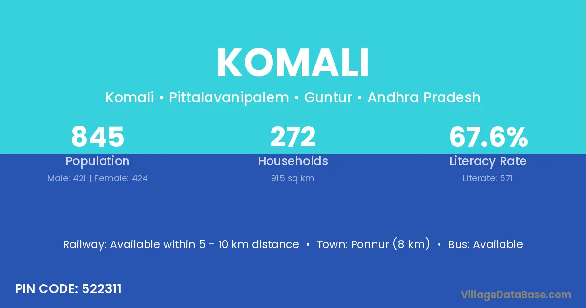 Komali village has a total population of 845 people, of which 421 are males and 424 are females.