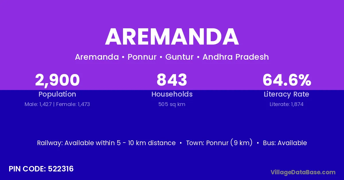 Ponnur (9 km) is the nearest town to Aremanda village for major economic activities and is located approximately 9 km away.